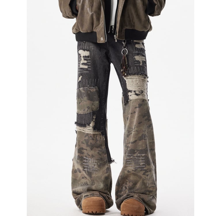 目を引くパッチワークデザインが特徴のワイドストレートデニム。