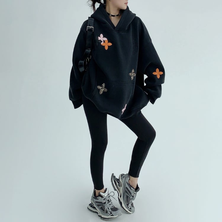 ゆったりとしたシルエットが魅力の長袖フーディ。オーバーサイズなので、リラックスした着心地で、カジュアルなスタイルにぴったりです。フロントのパッチポケットがアクセントになり、機能性も兼ね備えています。普段使いはもちろん、おうちでのリラックスタイムにもおすすめです。