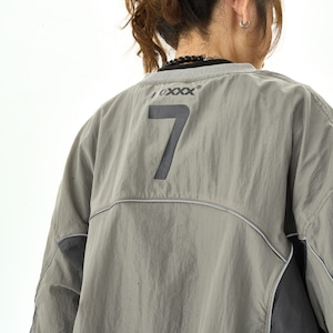 くすみカラーの配色と立体的な切替が映える一枚。軽やかなナイロン素材で、ゆるく抜け感のあるストリートスタイルに。