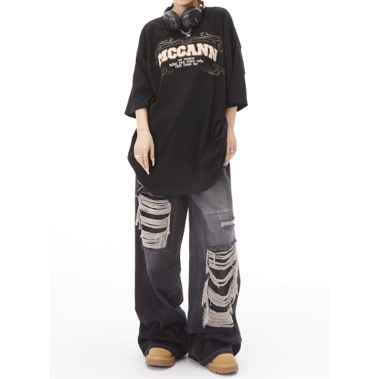 ラフな着こなしにぴったりの、ダメージ加工ワイドデニムパンツ。