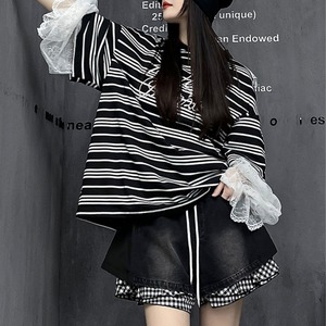 ボーダー柄 レース切替 長袖 ドロップショルダー Tシャツ L00048