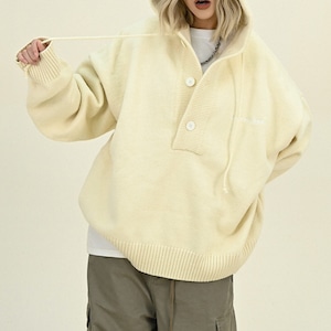 ハーフボタン ビッグシルエット ヒップ丈 ニットパーカー ◆2col L00062