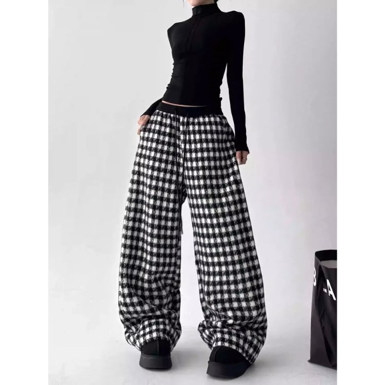 チェック柄 ワイド バレルレッグ パンツ ◆2col L00100