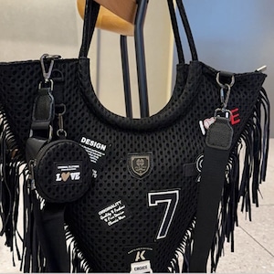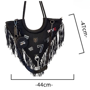 大胆なVラインシルエットにフリンジをあしらった、LUNOらしいアート感漂うトートバッグ。メッシュ素材で軽やかに仕上げつつ、ワッペンや刺繍モチーフが遊び心をプラス。背面にはジップポケット付きで、実用性も◎。ストリートにもモードにも馴染む個性派デザインで、コーデの主役になる一点です。