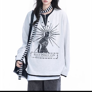 オーバーサイズのシルエットが魅力の長袖Tシャツ。フロントのボタンデザインがアクセントとなり、カジュアルながらも個性的な着こなしを演出します。普段使いはもちろん、ストリートファッションにも取り入れやすいアイテムです。