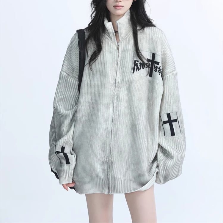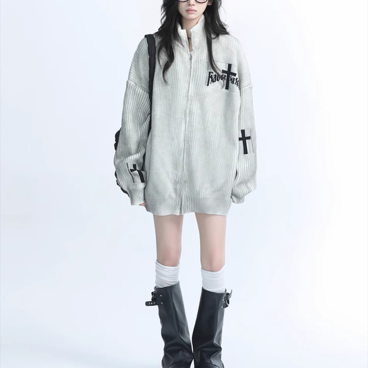 ジップアップ オーバーサイズ ヒップ丈 ニットカーディガン ◆2col L00226