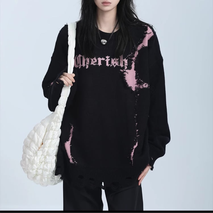 ダメージ加工 長袖 レギュラーサイズ ニット ◆2col L00221