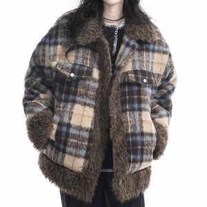 暖かみのあるチェック柄が目を引くヒップ丈ジャケットです。襟と袖口にあしらわれたファーが、上品さと季節感を演出。カジュアルなデニムから、きれいめなスカートまで、幅広いコーディネートに合わせやすい一着です。普段使いはもちろん、ちょっとしたお出かけにもおすすめです。
