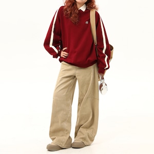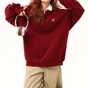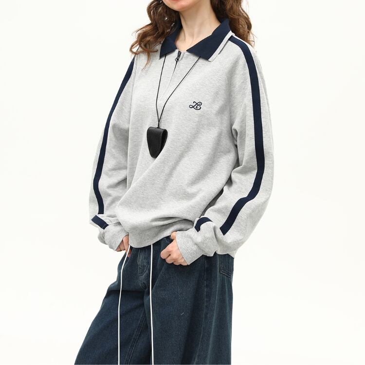 ハーフジップデザインがポイントのスウェット。袖のラインがアクセントになり、カジュアルながらもスタイリッシュな印象を与えます。