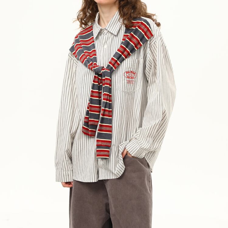 ストライプ柄が目を引く、ゆったりとしたシルエットの長袖シャツ。カジュアルな着こなしはもちろん、オフィスシーンにも活躍する一枚です。オーバーサイズなので、リラックスして着用でき、体型カバーにも役立ちます。シンプルなボトムスと合わせるだけで、こなれ感のあるスタイリングが完成します。