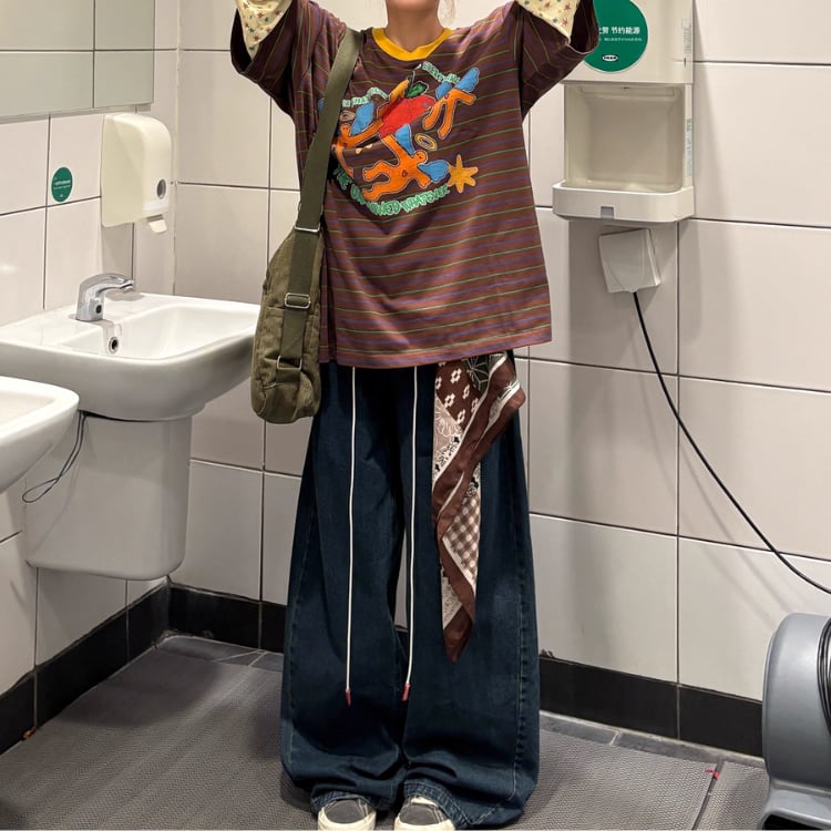 ボーダー柄 ラウンドネック 長袖 ドロップショルダー Tシャツ ◆2col L00140