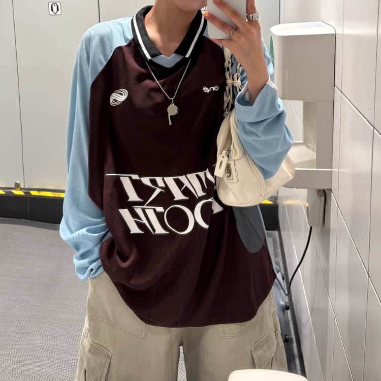 オープンカラーとラグラン袖が特徴的な長袖シャツです。