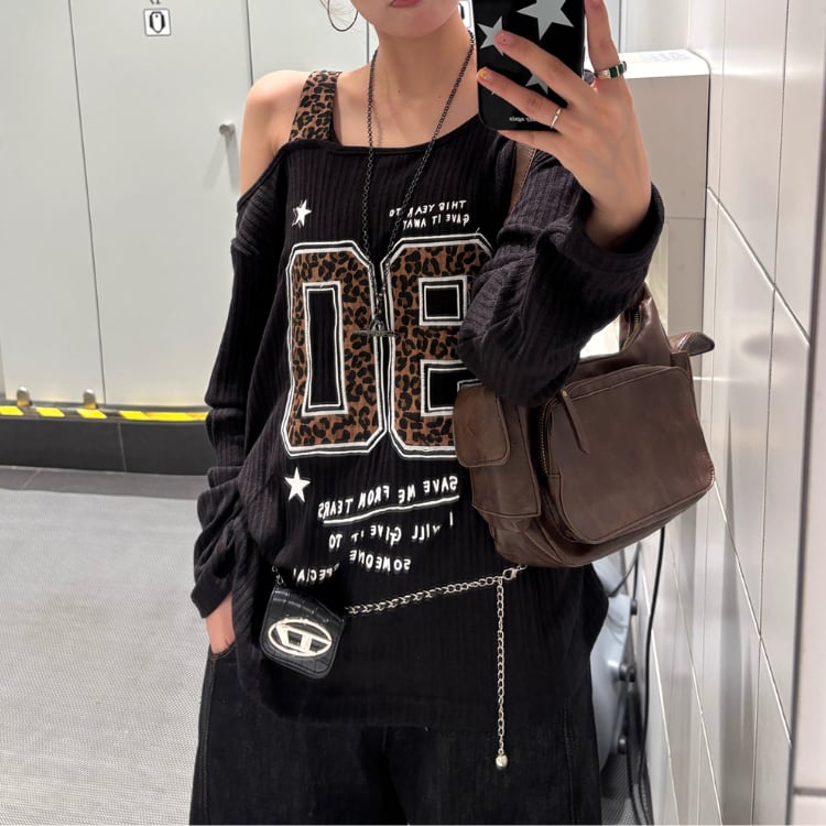肩のラインを美しく見せる、ショルダーカットデザインのリブ編みカットソー。