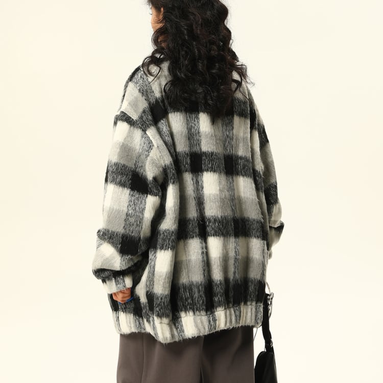 チェック柄が目を引く、オープンカラーのヒップ丈ジャケットです。