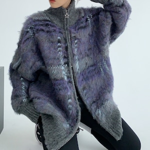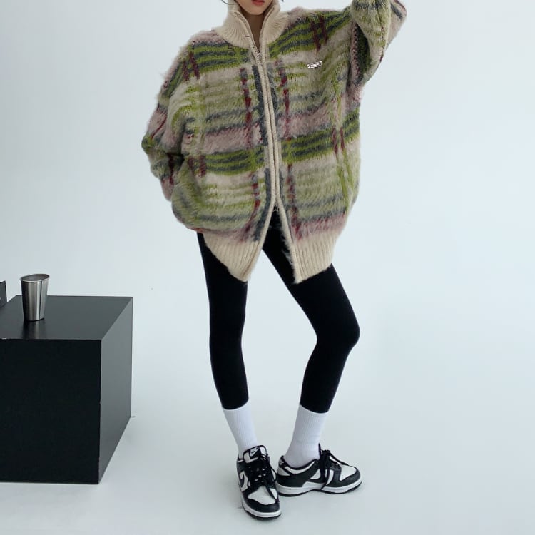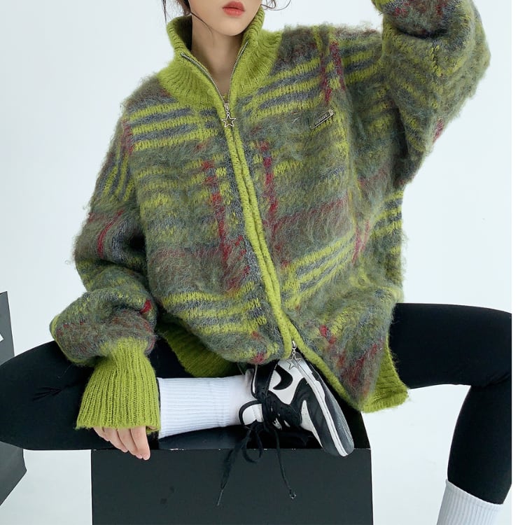 チェック柄 ジップアップ ニットジャケット ◆3col L00288