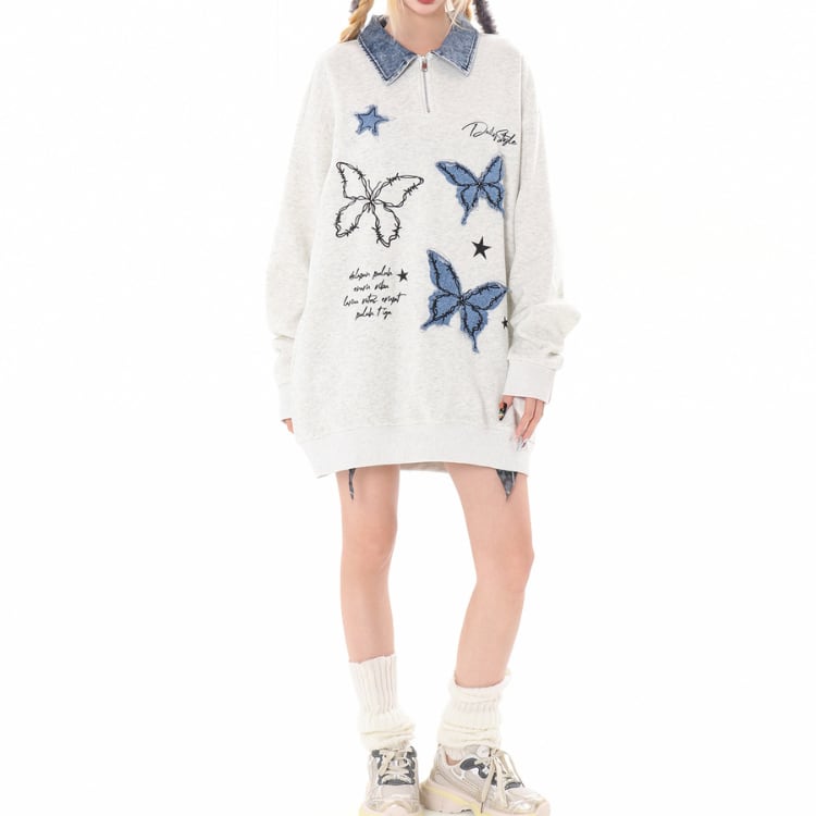 蝶や星のモチーフがポイントの長袖スウェットシャツ。
