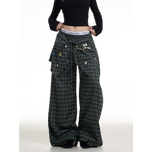 目を引くチェック柄とワイドシルエットが特徴のパンツです。