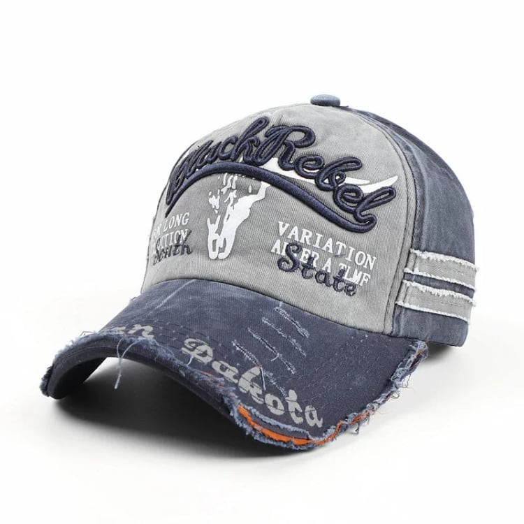 フロントの「Black Rebel」立体ロゴ刺繍と、ツバ部分のクラッシュ加工が存在感を放ちます。