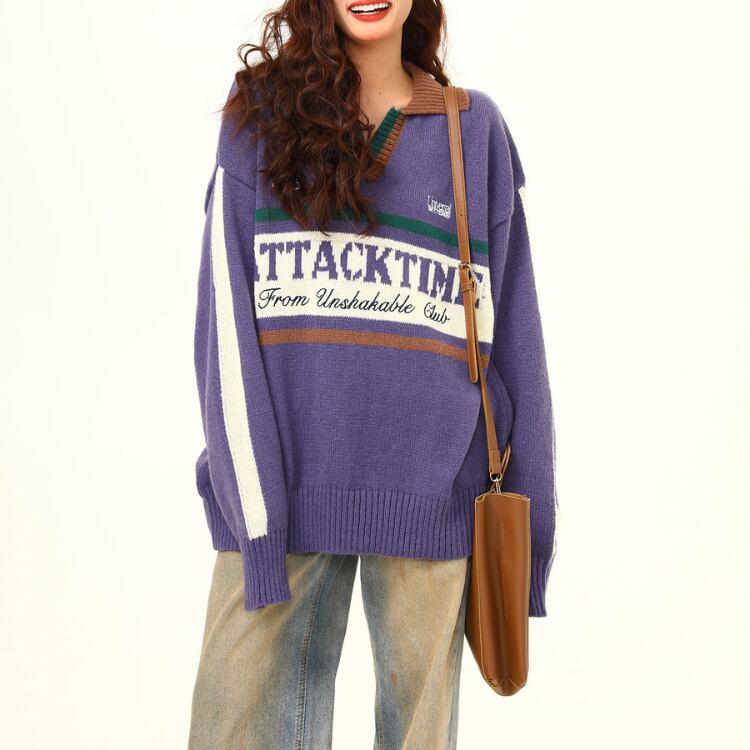 ロゴ 長袖 オーバーサイズ ニットポロシャツ ◆2col L00175