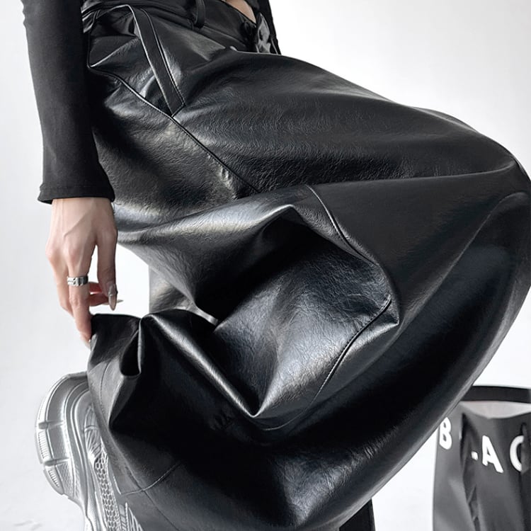 ハリ感のあるフェイクレザー素材を採用し、脚のラインを拾わずモードな存在感を演出します。