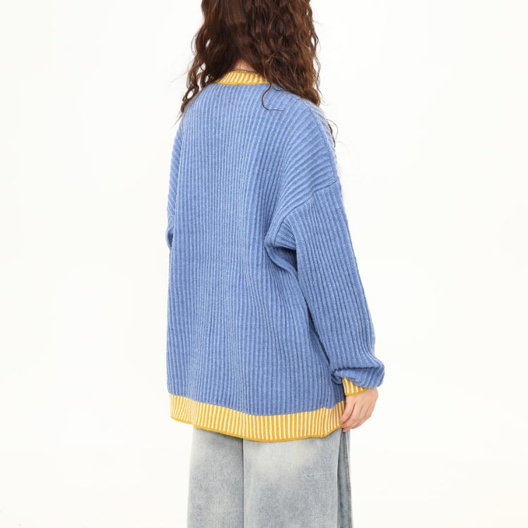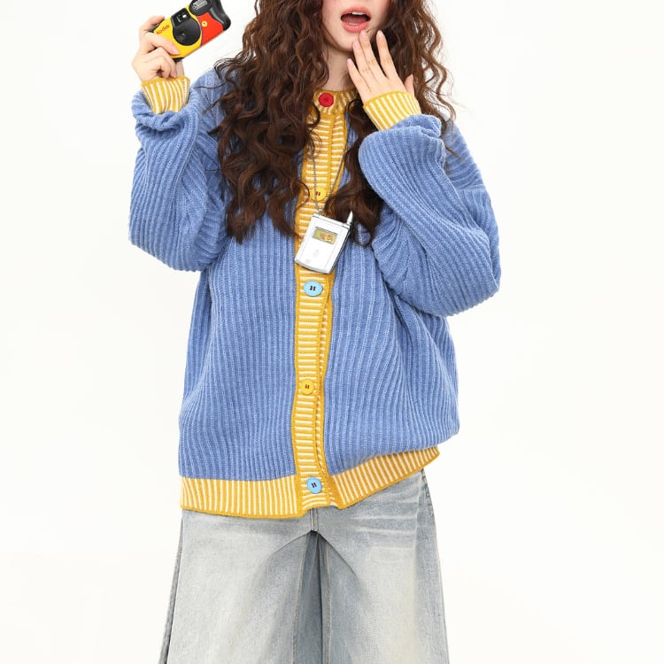 存在感のある配色デザインとカラーボタンがポイントのリブカーディガン。