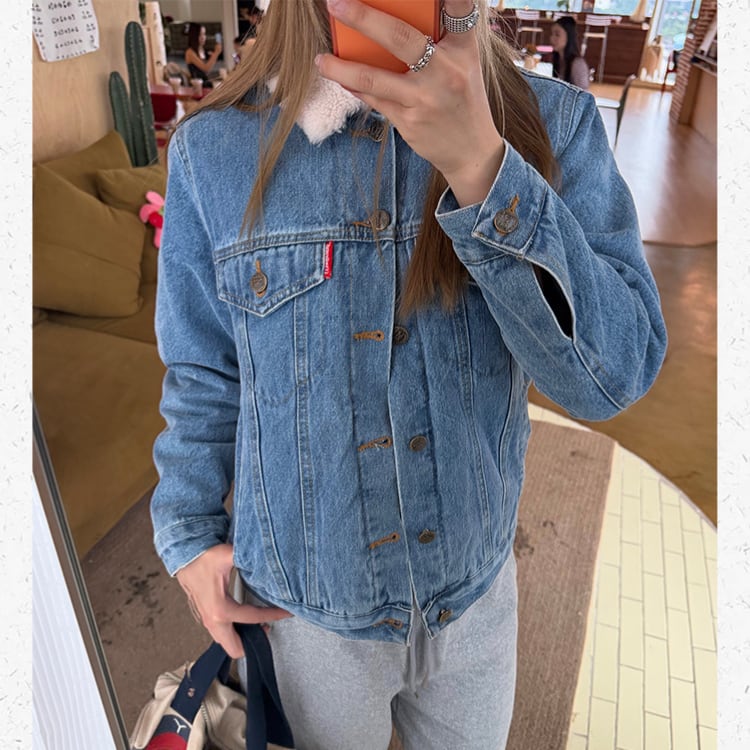 襟元にフェイクファーをあしらったデニムジャケット。