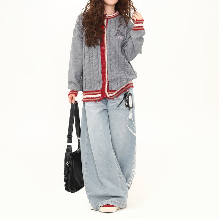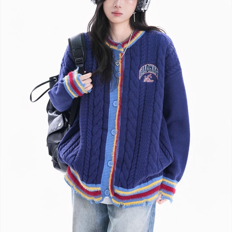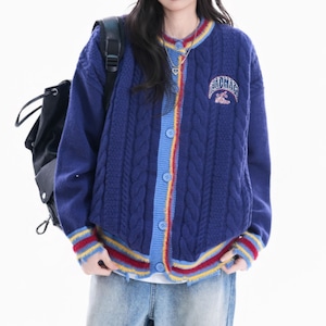 太めのケーブル編みと大胆な配色デザインが目を引くゆるシルエットカーディガン。