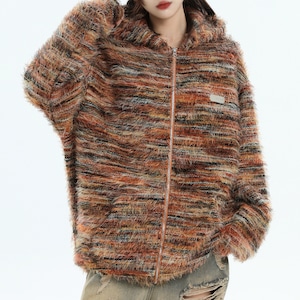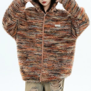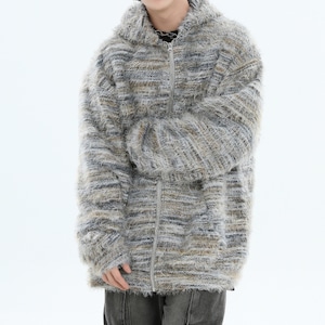 毛足のあるフェザーニット素材を使用したフード付きジップフーディです。