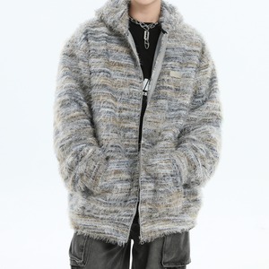 フロントファスナー仕様で羽織りとして使いやすく、ミックス感のある編み柄がコーディネートに表情を加えます。