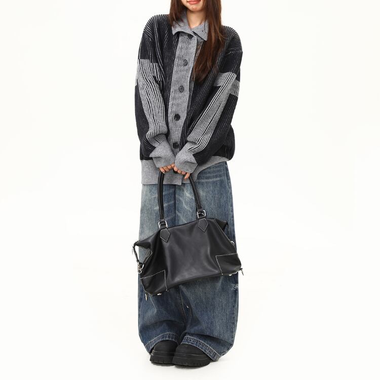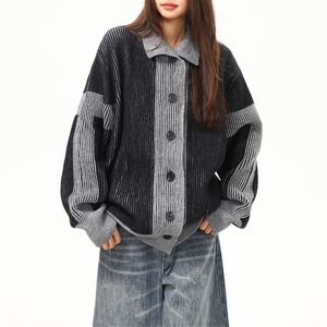 畝のあるリブ編みニットをベースに、配色切り替えを取り入れたカーディガンです。