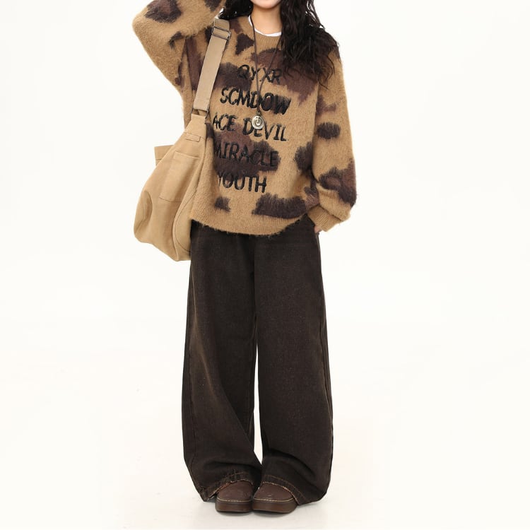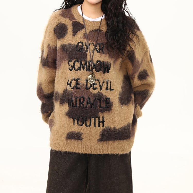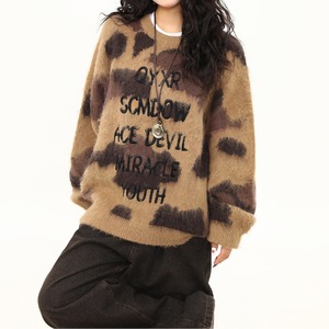 ランダム感のあるカモフラージュ風配色に、フロントロゴを重ねたニットプルオーバーです。