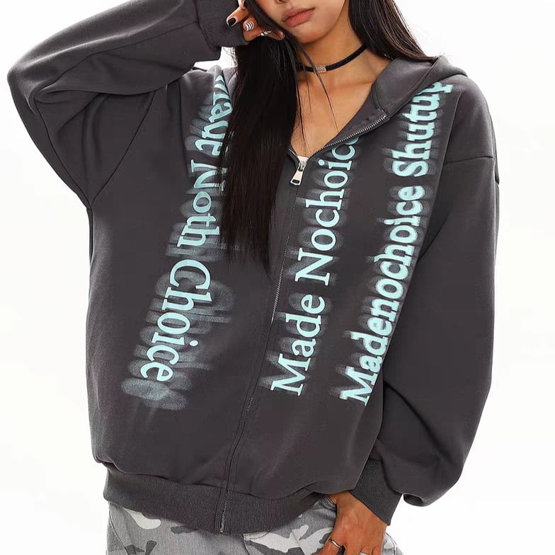 フロントに縦配置されたロゴプリントが特徴のジップアップパーカー。