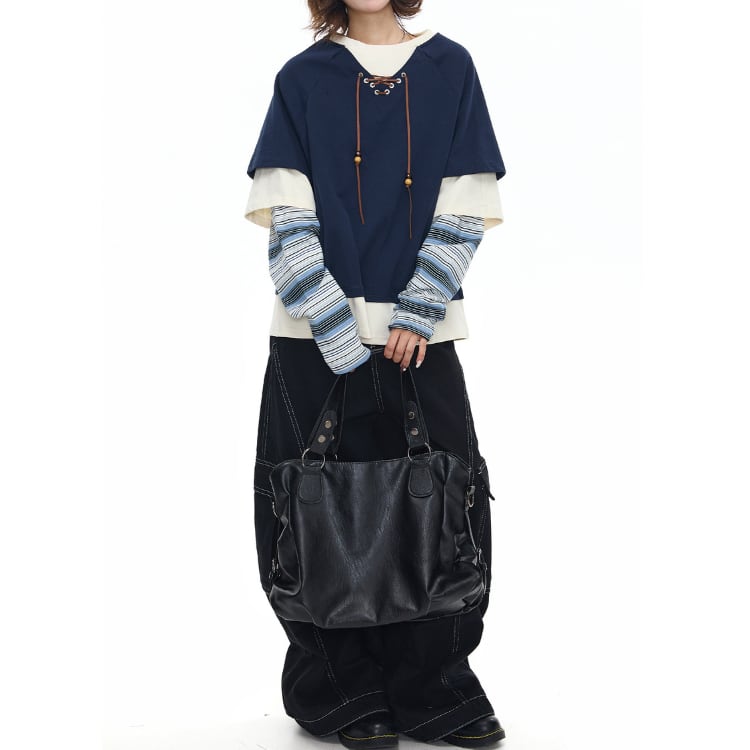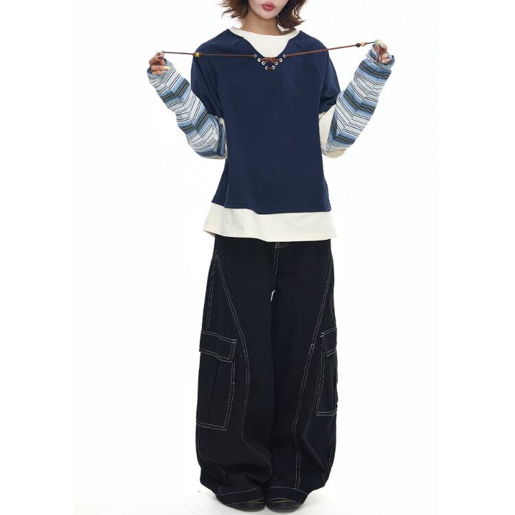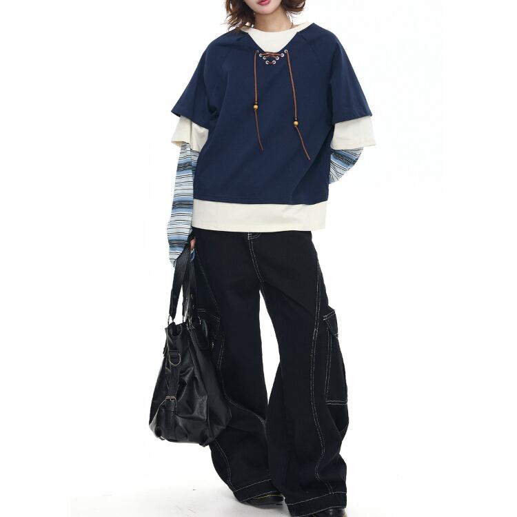 レイヤード風 長袖 ボーダー スリーブ カットソー ◆2col L60008