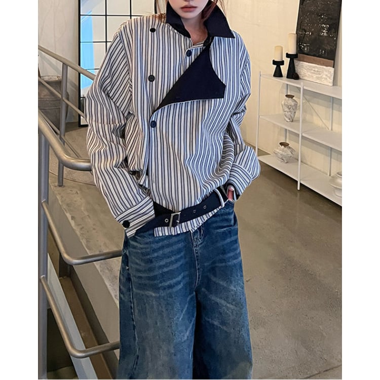 個性的なアシンメトリーデザインが目を引くストライプシャツ。